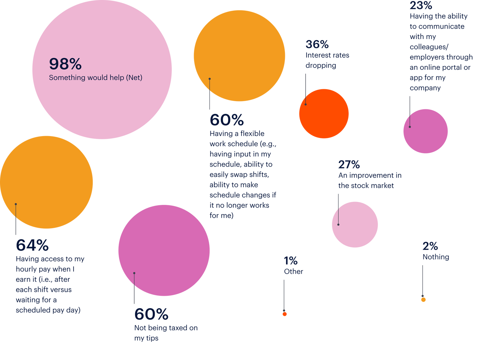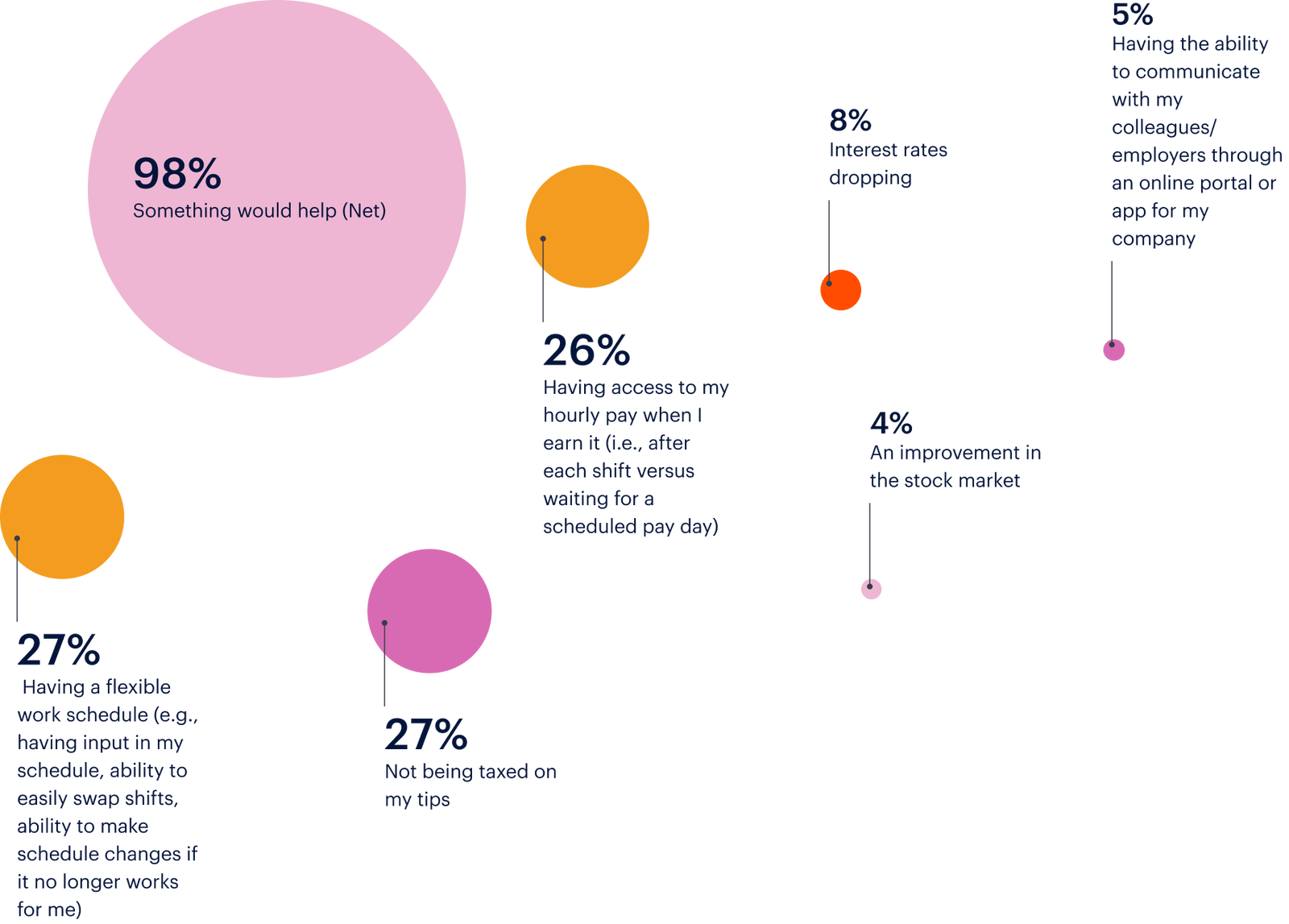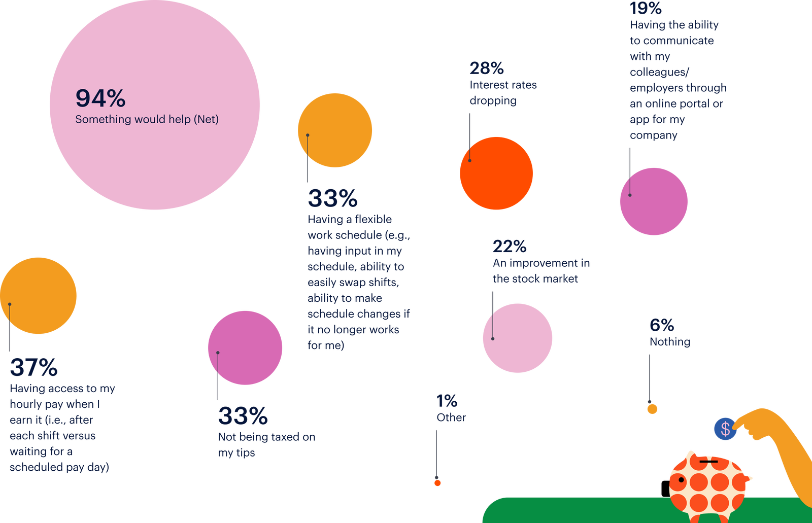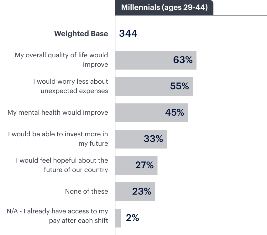 The poll revealed that (63%) of millennial tipped hourly workers say their overall quality of life would improve with access to earned wage access. And (55%) said they would worry less about expenses with access to earned pay.